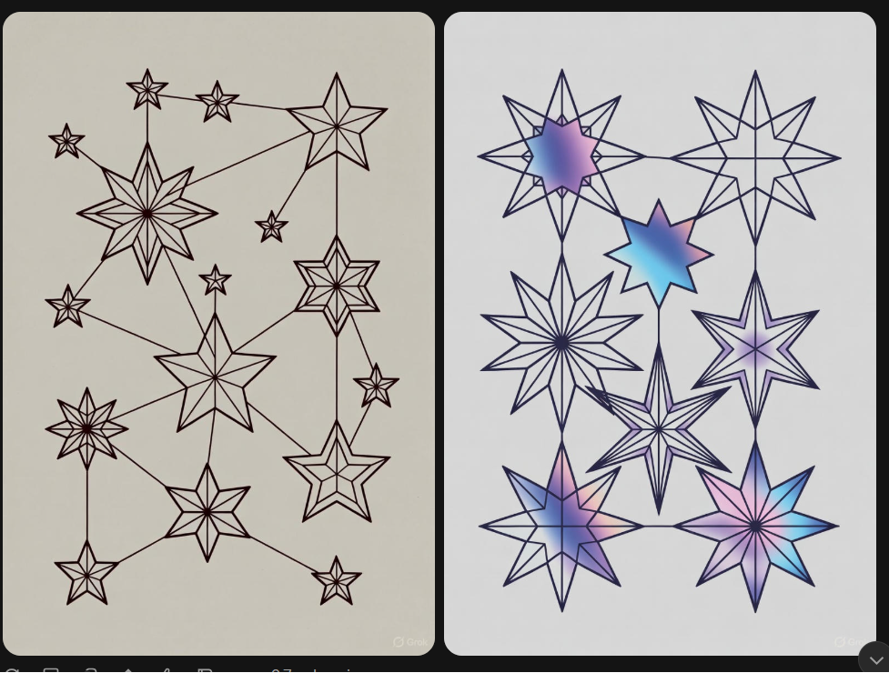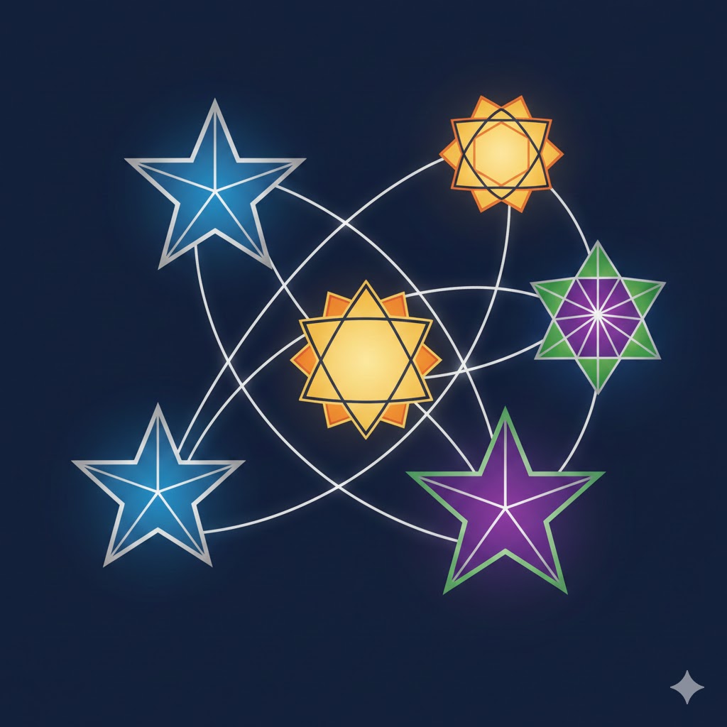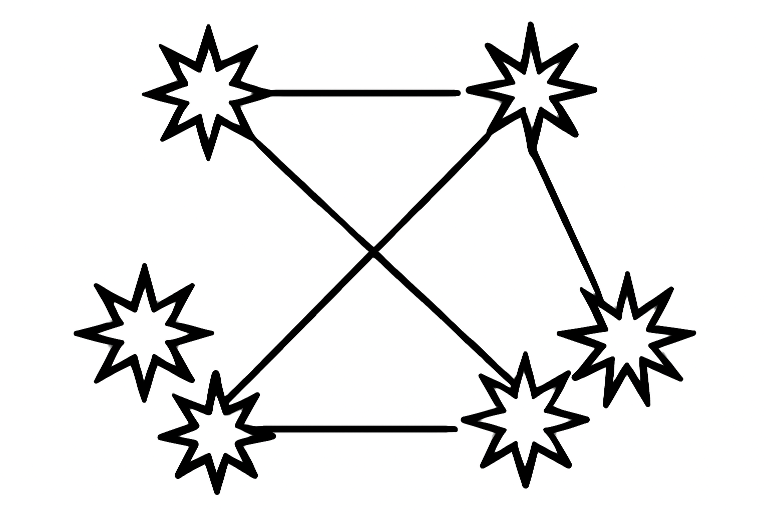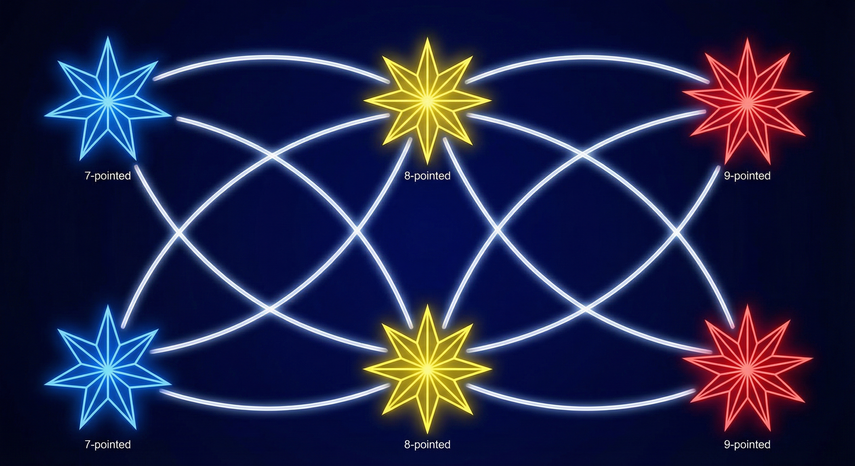 Create an image that displays two seven-pointed stars, two eight-pointed stars, and two nine-pointed stars. All stars are connected to each other, except for the ones with the same number of strands. The lines connecting the stars must NOT intersect.